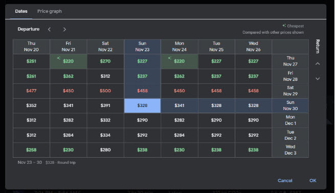 Google color-codes prices (green for cheap, red for expensive) to instantly spot the best deals. Flying one day earlier or later can save $100-200 per ticket.